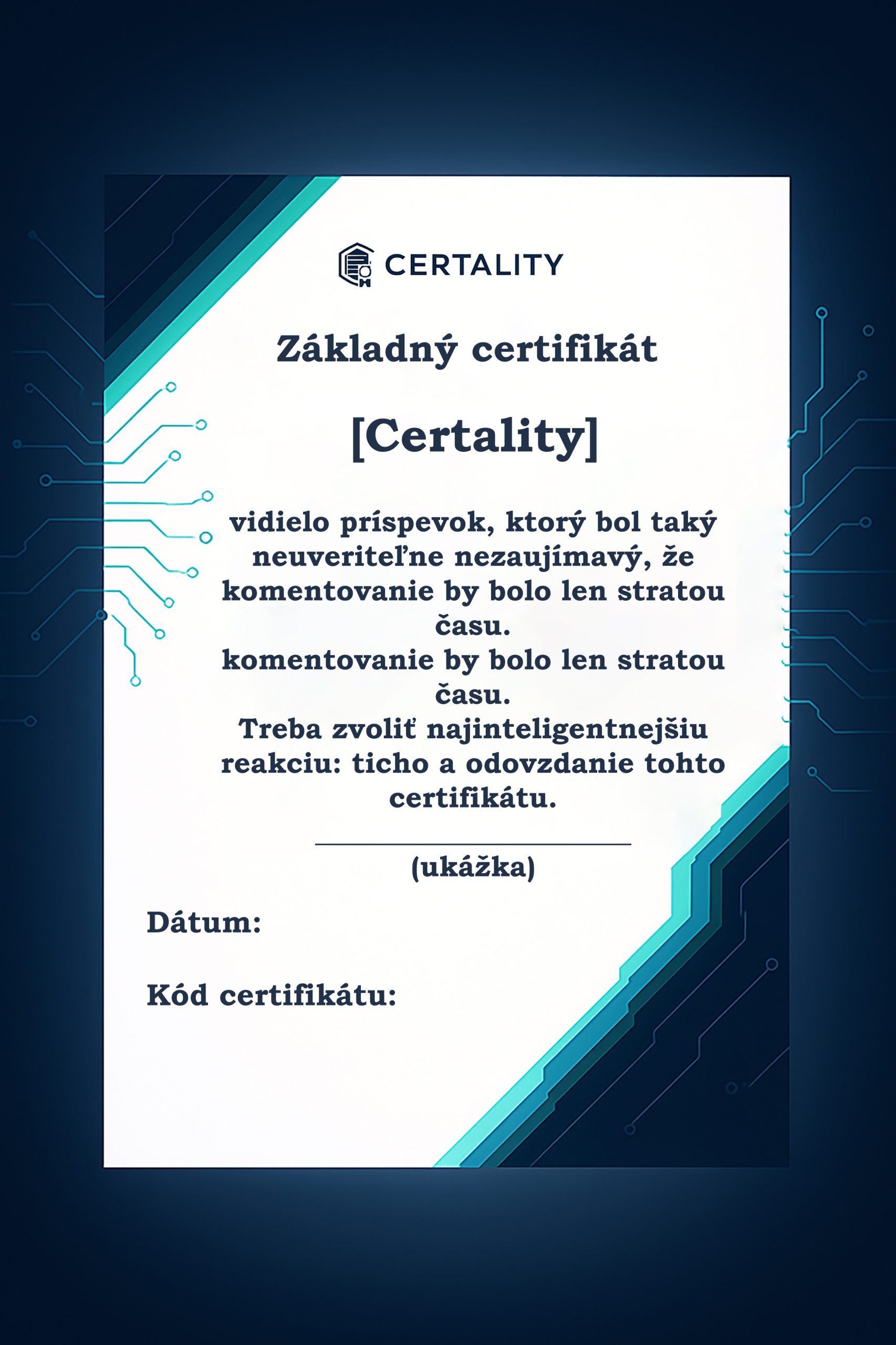 Udeľte tento certifikát pod každý príspevok, ktorý šíri chaos a emócie bez zmyslu, a ukonči diskusiu s eleganciou a vtipom. Je to ten najlepší spôsob, ako povedať „dosť“ bez toho, aby ste sa do hádky vôbec zapojili.